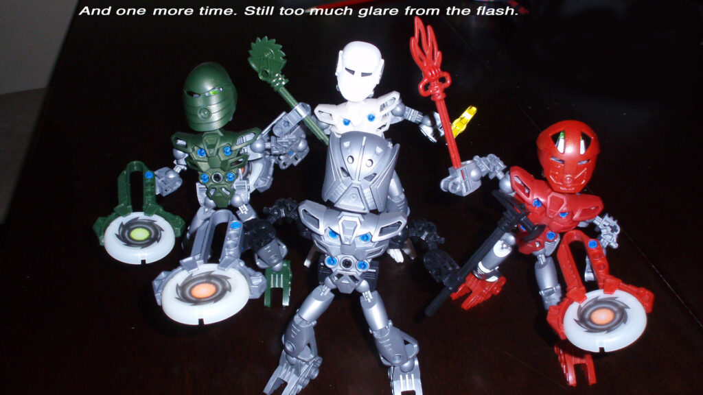 Là aussi, ils sont pointés du doigt comme étant du sous-BIONICLE. Ce qui n’est pas faux, et d’après certains ils pourraient même abîmer les véritables pièces si on s’amusait à les mélanger. Seulement voilà, comme vous pouvez le voir sur les images ci-dessus, certains ont des pièces BIONICLE… Dans de nouvelles couleurs ! Vous le voyez ce Kiril marron ? Ce Matatu argenté ?